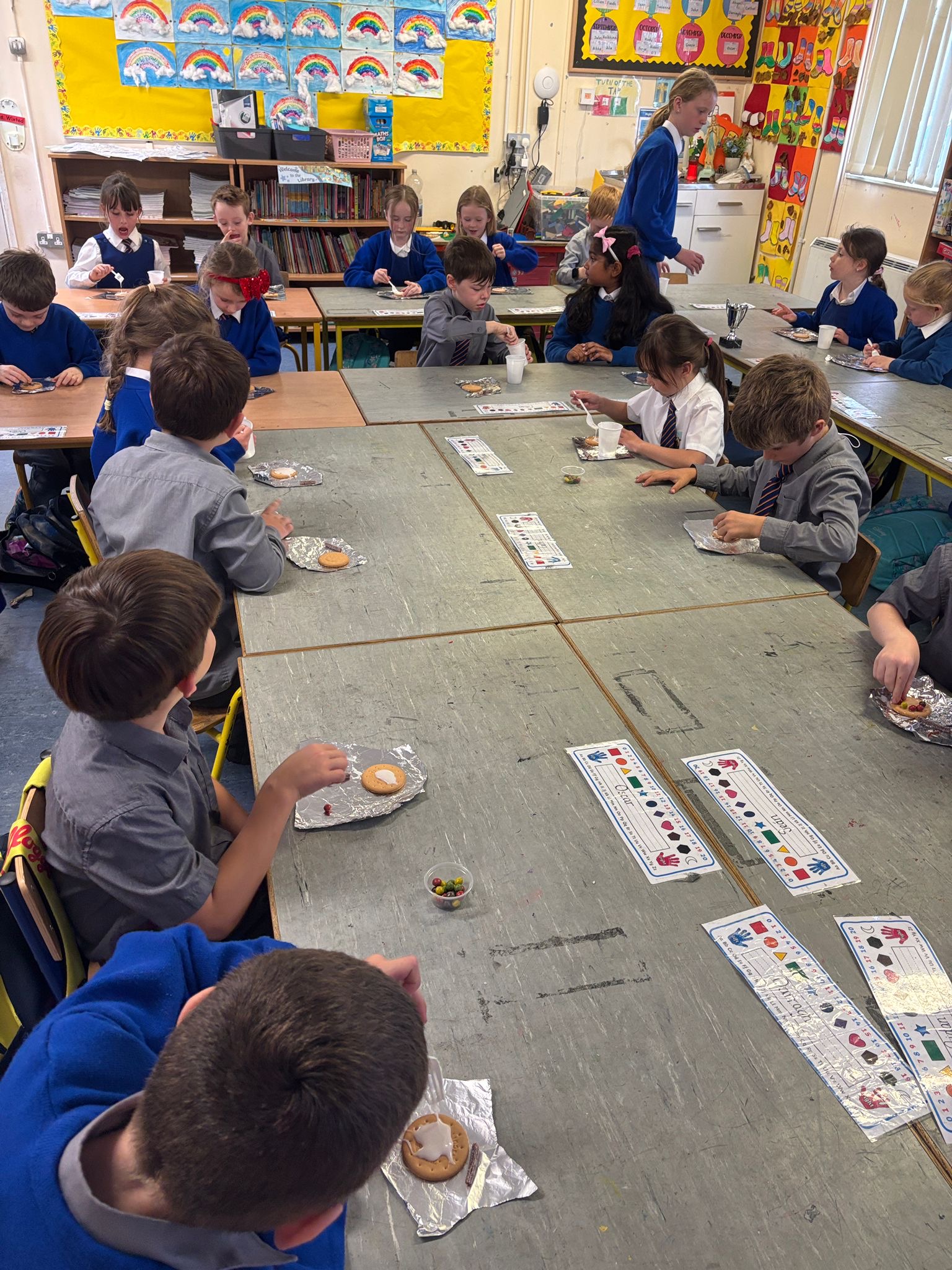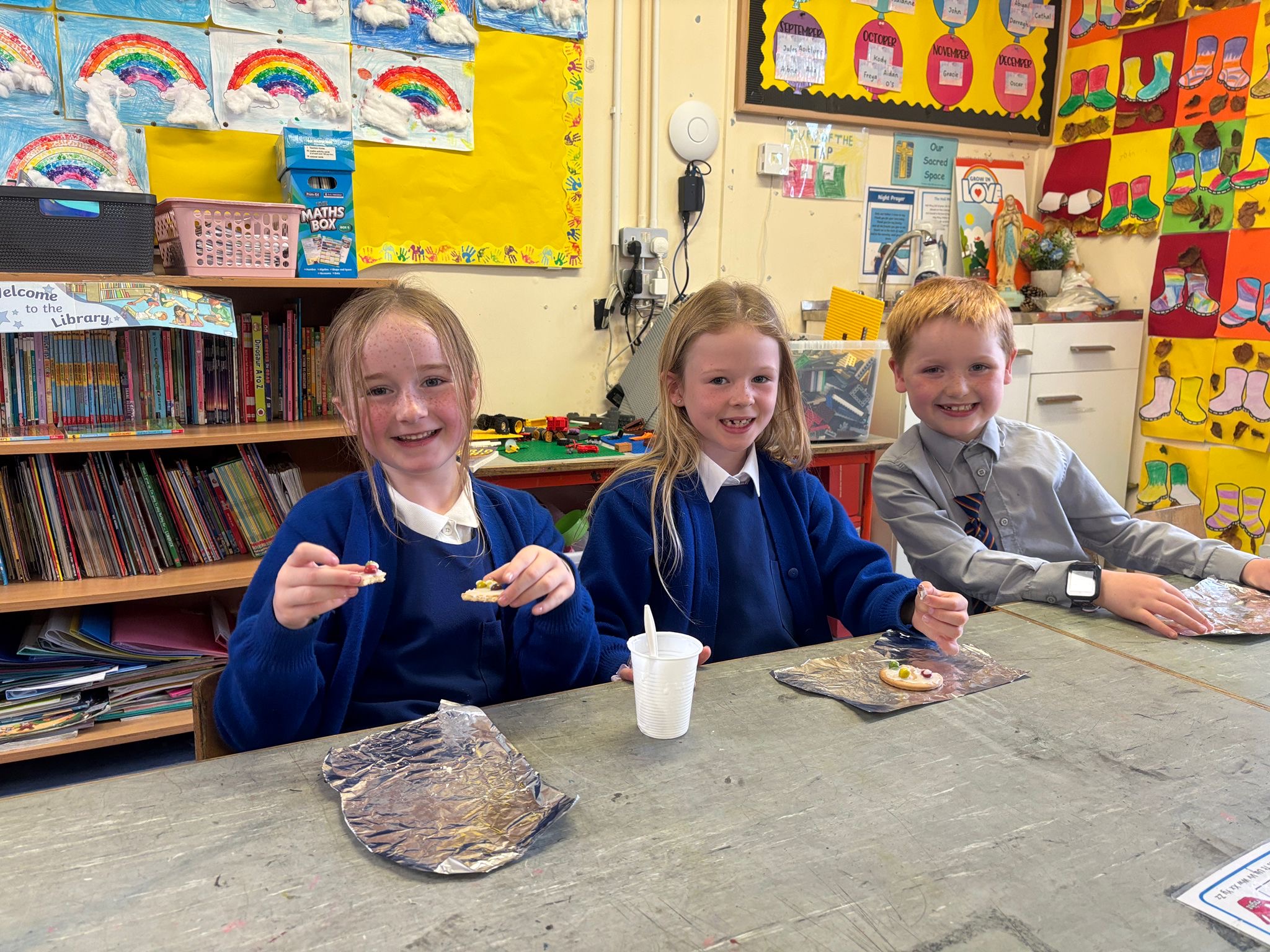 As part of our Autumn theme in Oral Language and SESE, lots of pupils brought in treasures for our nature table — including conkers, acorns and colourful leaves. We created some beautiful art by designing wellies and stuck some autumn leaves on our pictures. We also decorated biscuits to look like autumn trees using icing, brown jellies and smarties. We were so excited to eat our wonderful creations.