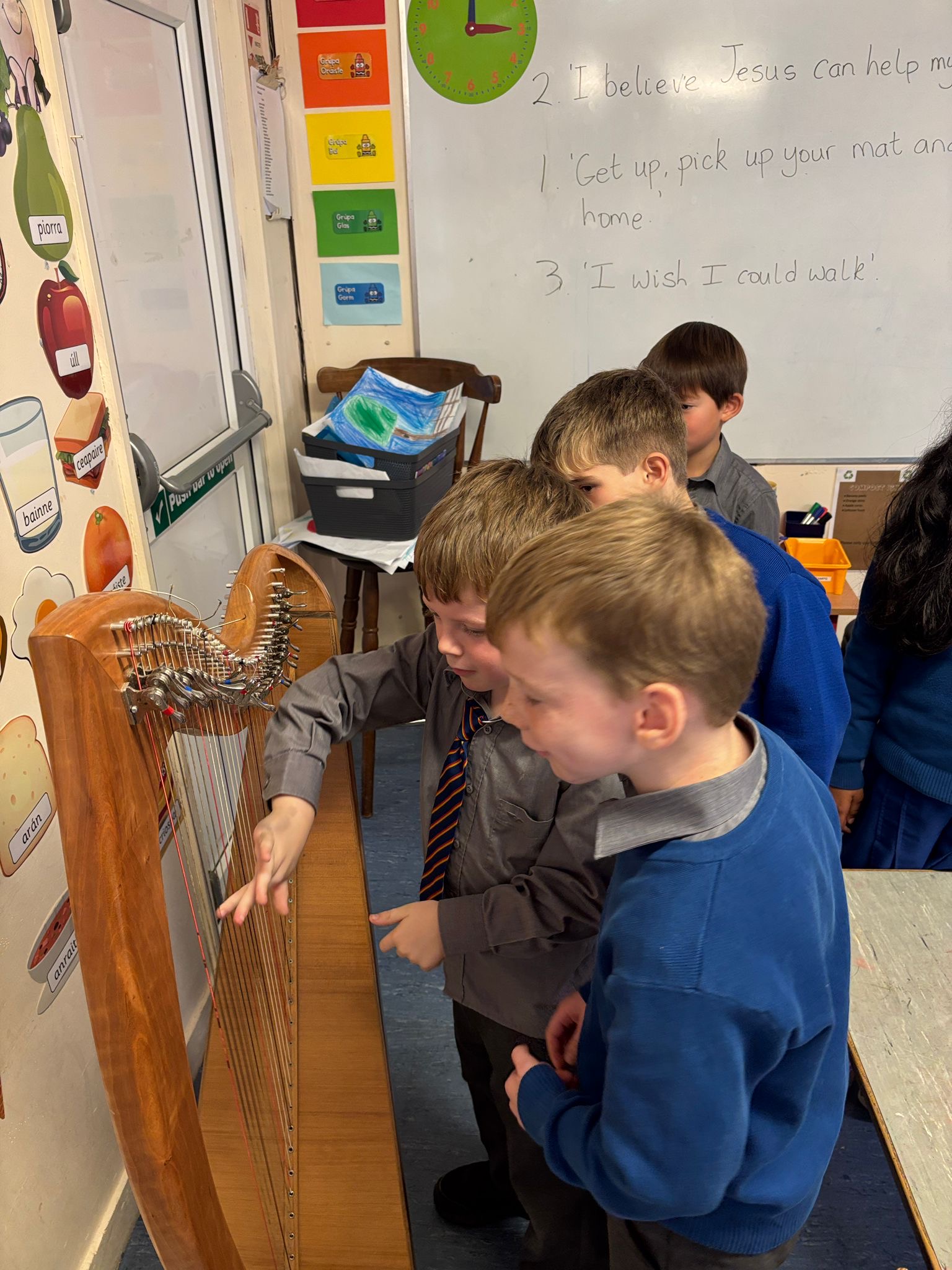 On Mondays, we look forward to Music Generation. This month we used boom whackers to create different notes and chords, and love playing the game ‘Don’t clap this one back’. We also had the chance to play Ms. Wixted’s harp, and listened to her play a variety of musical genres.